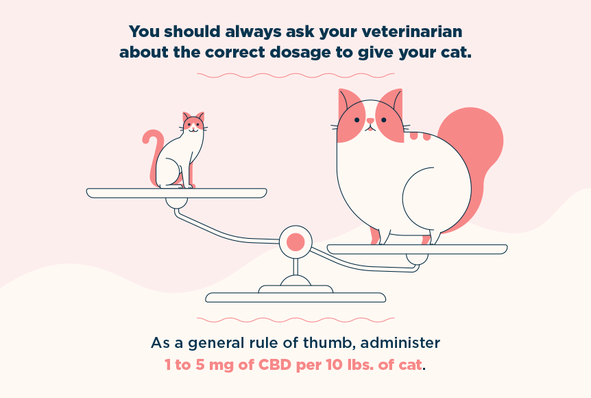 When determining CBD oil dosage for cats, it’s best to start with very small doses and slowly increase to the recommended dose depending on your cat’s condition. That way, you can see how your cat reacts to the CBD. You should ask your veterinarian about the correct dosage to give your cat, however, a general guideline is about 1 to 5 mg of CBD per 10 lbs. of weight.