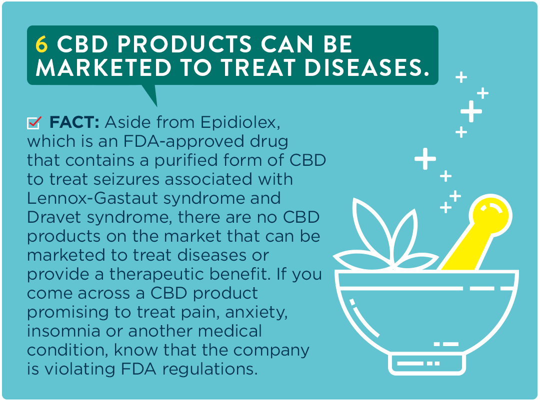 Fact: Aside from Epidiolex, which is an FDA-approved drug that contains a purified form of CBD to treat seizures associated with Lennox-Gastaut syndrome and Dravet syndrome, two rare forms of epilepsy in people 2 years and older, there are no CBD products that can be marketed to treat diseases or provide a therapeutic benefit. Buyer beware. If you come across a CBD product that promises to treat pain, anxiety, insomnia or another medical condition, know that the company is violating FDA regulations and the claim hasn’t been proven.