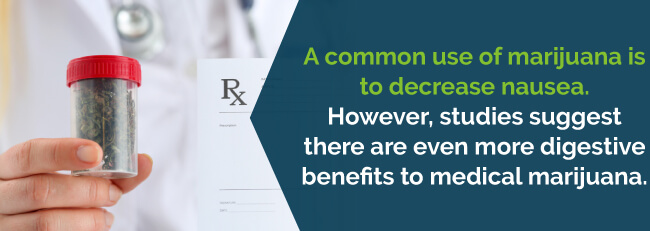 A common use of marijuana is to decrease nausea. However, studies suggest there are even more digestive benefits to medical marijuana. It may even play a role in various health conditions related to digestion, such as: