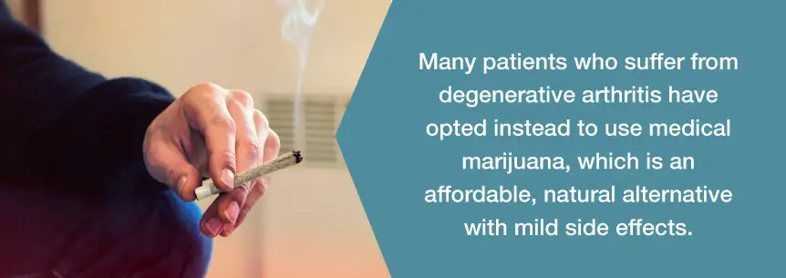 Currently, doctors use more than 100 medications and drugs to treat arthritis. But many patients who suffer from degenerative arthritis have opted instead to use medical marijuana, which is an affordable, natural alternative with mild side effects.