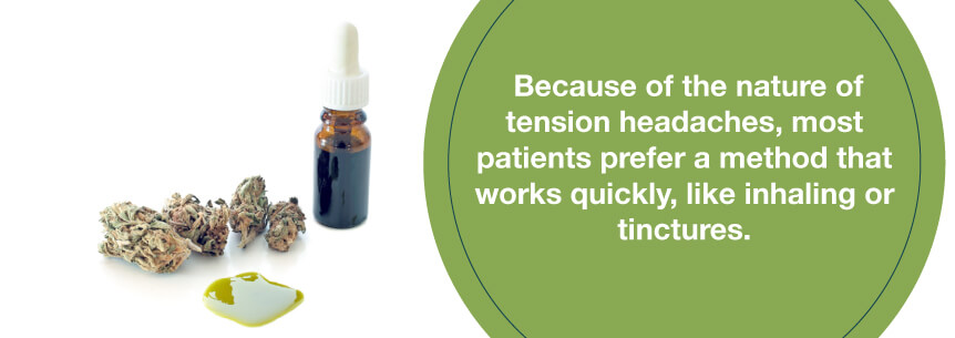 There are many different ways a patient can consume medical marijuana. Because of the nature of tension headaches, most patients prefer a method that works quickly, like inhaling or tinctures. However, ingesting medication orally and using topicals also offer distinct benefits. Here is a breakdown of some of the benefits and drawbacks of different methods of ingestion.